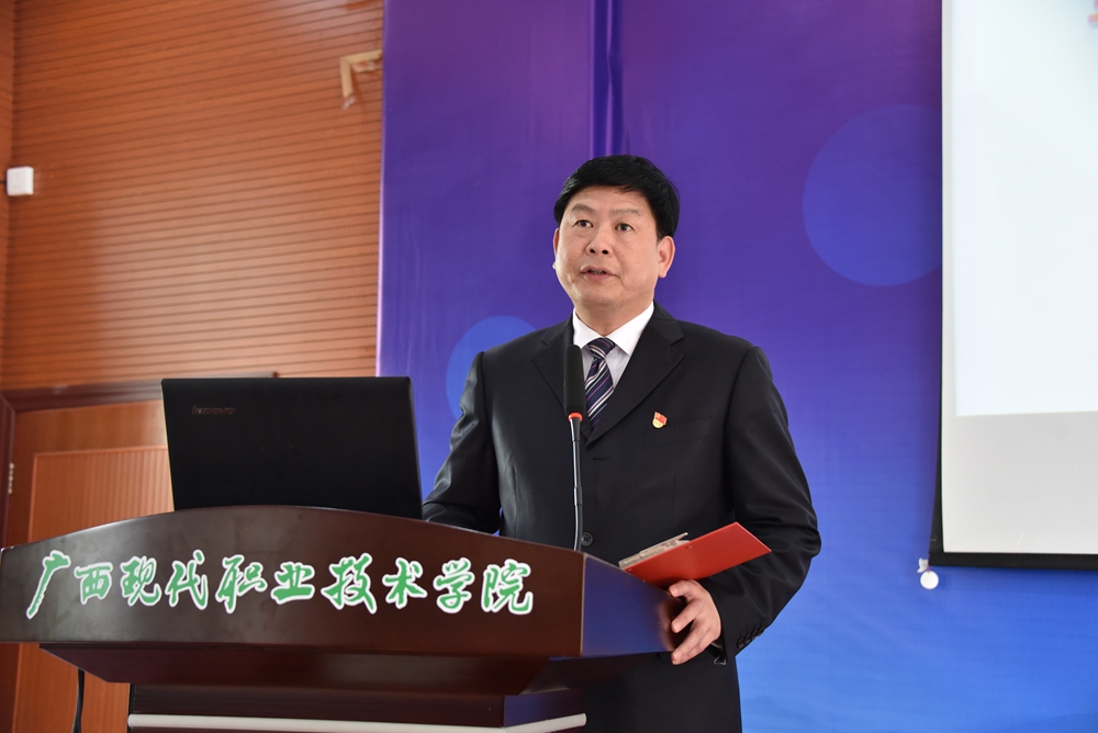 随后,在我院第二学术报告厅召开了2019年河池市职业教育集团年会。河池市职业教育集团理事长、广西现代职业技术学院党委书记、市职教中心校长韦伟松,河池市职业教育集团常务副理事长、广西现代职业技术学院院长黄绍光,市教育局、市工业和信息化局、河池市商务局、市扶贫开发办公室市水库和扶贫易地安置局、市人力资源和社会保障局、市大数据发展局、市工业园区管委会、南丹工业园区管理委员会等部门相关负责人,以及各县区职教中心、企业、行业代表应邀出席会议。会议由学院副院长冯忠伟主持。