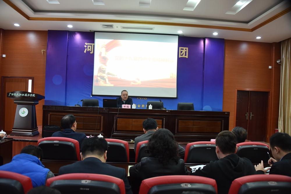 根据市委统一安排,12月19日,河池市委宣讲团、河池市纪委常委、监委委员田福到我院宣讲党的十九届四中全会精神。学院党委书记韦伟松,副院长韦胜东、冯忠伟,纪委书记张斌出席宣讲会。学院全体中层干部、教职工、各系学生代表参加座谈会。会议由学院党委书记韦伟松主持。