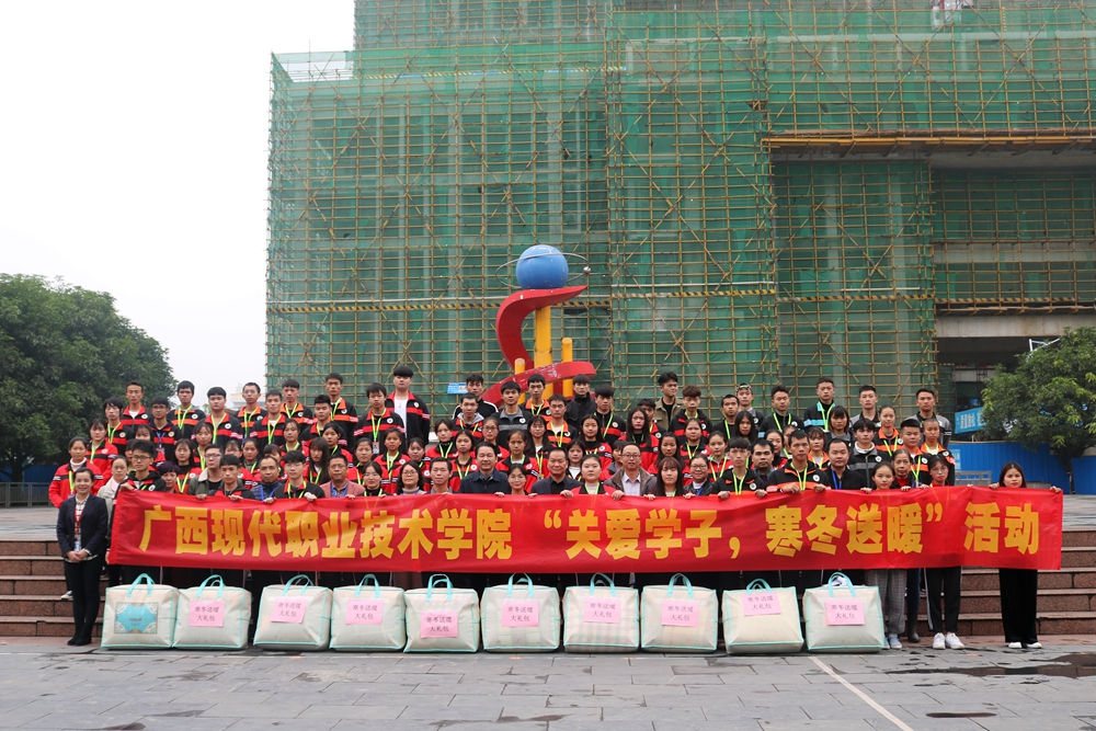 随后院长黄绍光、院长助理覃孜、学工处处长李铃给予学生代表赠送冬季暖心包,并到喷泉广场一起合影。本次活动充分体现了学院全体师生对贫困学子的爱心,真正把学院的关爱、温暖送到每个学子的心坎上,使他们切身感受到学院这个大家庭的温暖。