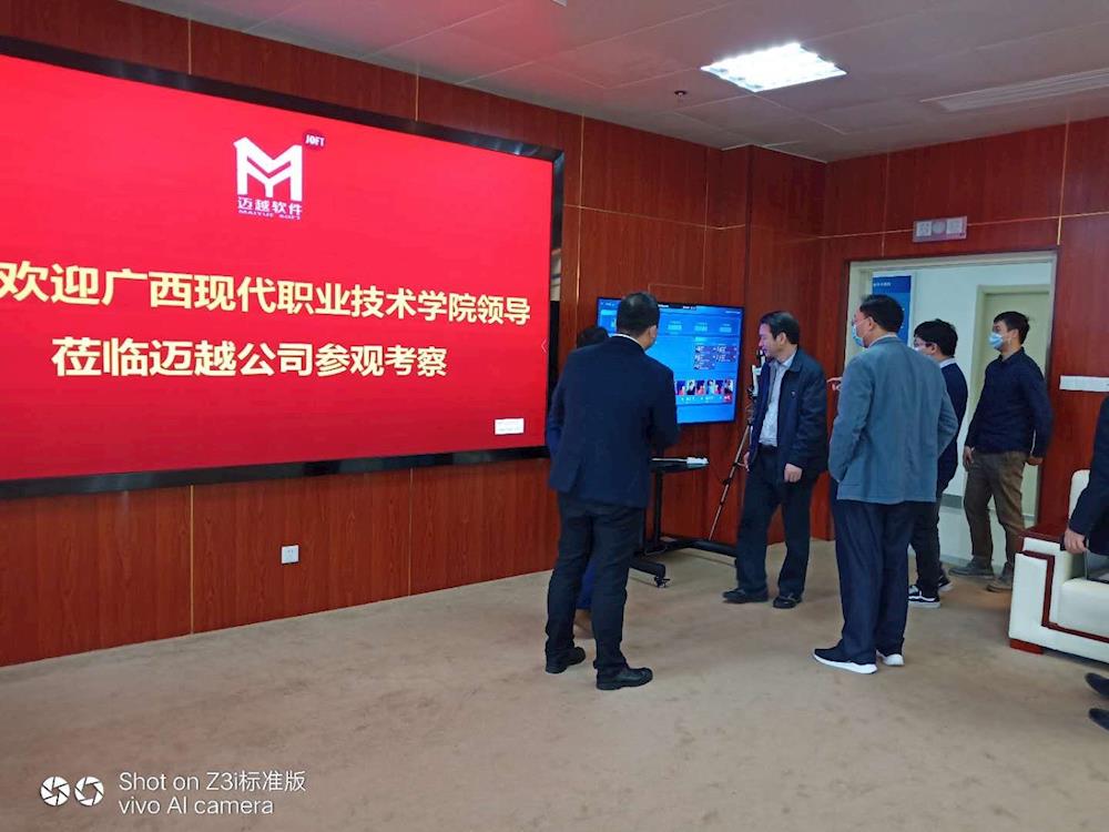 参观南宁市迈越软件有限责任公司环境后,双方进行了合作交流,黄绍光院长向迈越公司负责人就我院的发展情况、信息化建设、人才培养、师资队伍建设等方面作了简单介绍,迈越公司负责人向黄院长介绍了公司的基本情况、发展战略,双方还就今后合作做了进一步交流。