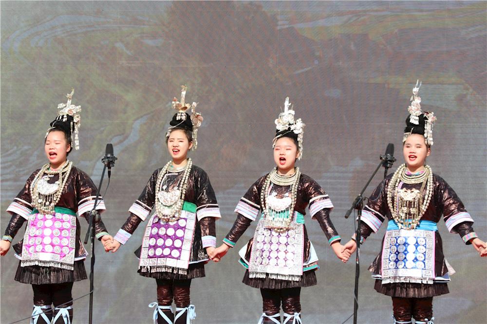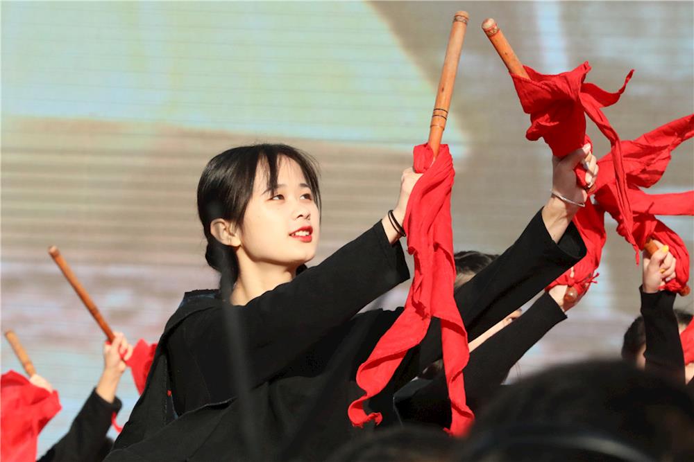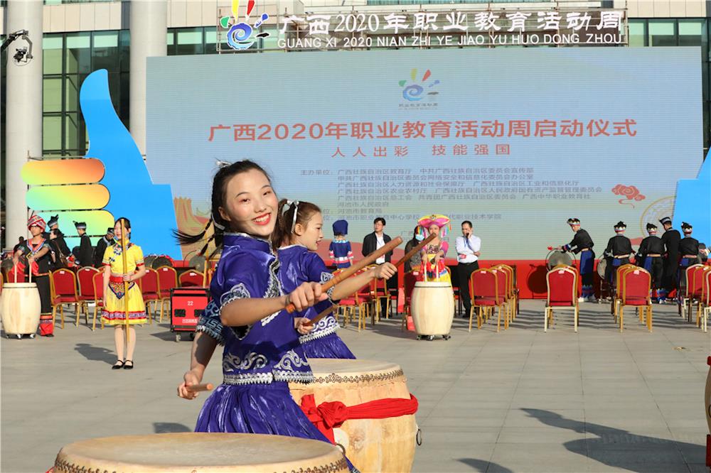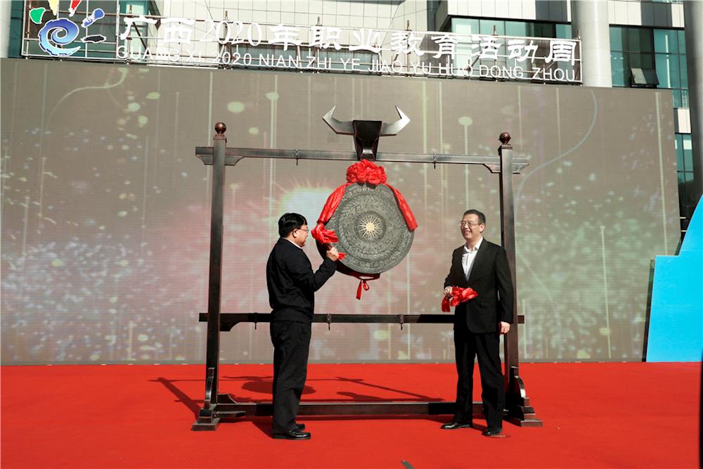 仪式上,自治区党委教育工委书记、教育厅厅长唐咸仅,河池市委副书记、统战部部长唐标文一起敲响铜鼓,共同启动广西2020年职业教育活动周。