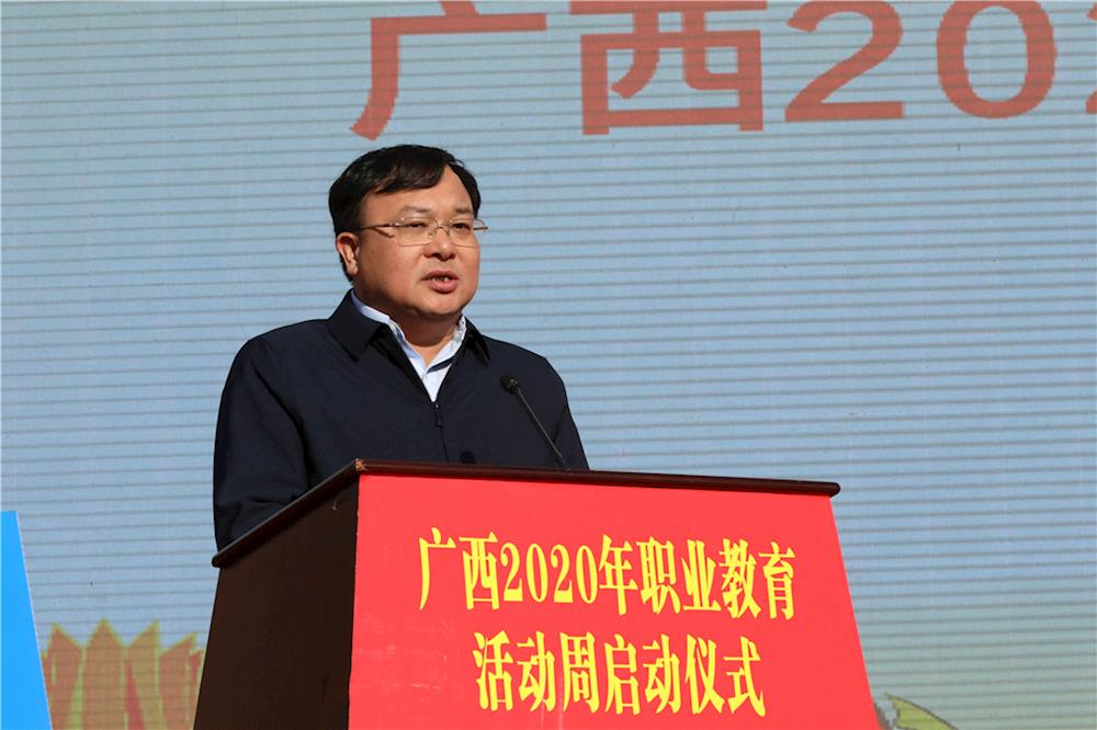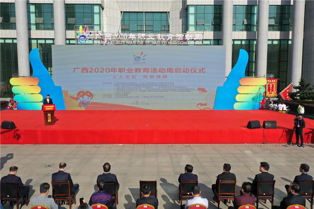 在全国上下掀起学习贯彻党的十九届五中全会精神热潮之际, 11月12日上午,由自治区教育厅等主办的、以“人人出彩,技能强国”为主题的广西2020年职业教育活动周启动仪式在河池市职业教育中心学校举行。自治区党委教育工委书记、教育厅厅长唐咸仅,河池市委副书记、统战部部长唐标文,副市长韦祖林等领导出席启动仪式,自治区工信局、农村农业厅、国资委、总工会、团区委、中华职教社等单位领导,河池市有关部门领导、各市教育局领导、职成科科长、各高职院校校长、各中职学校校长,以及行业、企业代表,部分初、高中和职业院校师生代表共计1万余人参加启动仪式。启动仪式由自治区教育厅副厅长李勇齐主持。