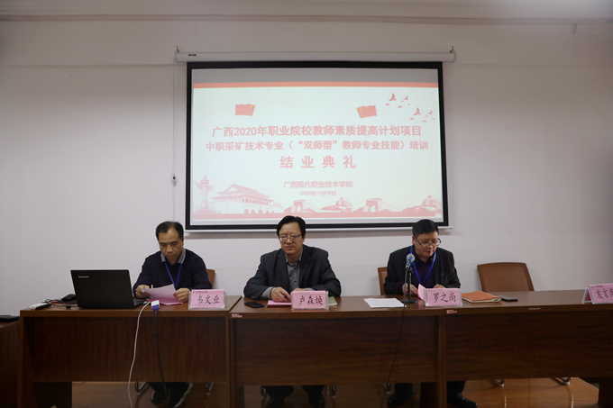 11月18日上午,由广西壮族自治区教育厅主办、我院承办的广西2020年职业学院教师素质提高计划项目——中职采矿技术专业“双师型”教师专业技能培训班结业典礼,在我院电商大楼二楼会议室举行。学院副院长卢森焕、资源工程系党支部书记韦文业、培训部主任罗之尚以及全体参训学员参加结业典礼。本次活动由培训部主任罗之尚主持。