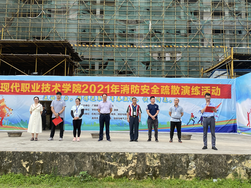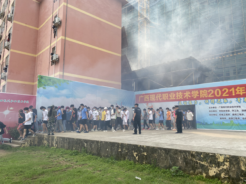 为进一步贯彻落实《自治区教育厅关于进一步加强学校消防安全工作的通知》(桂教安稳{2021}11 号)文件工作要求,切实提高广大师生防火安全意识和危机事件应对能力,保护师生的生命和学校财产不受损害,2021年5月29日上午,学院在田径场开展宿舍楼火灾事故逃生自救应急逃生疏散演练活动。学院副院长杨奎出席活动,保卫处副处长韦俊、罗明都,学生安全工作处副处长韦世安,宣传部副部长唐迪,教育系书记覃琳琳,信电系书记兰建扬等领导参加活动,本次演练由保卫处副处长韦俊主持。