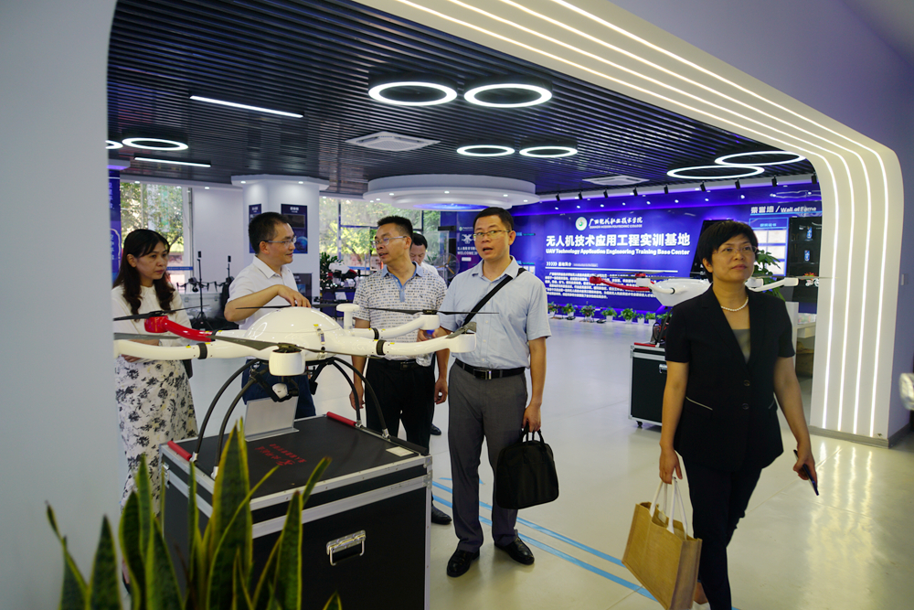 7月13日下午,河池学院党委书记韦安光率队到我院考察调研,在河池学院党委副书记、我院党委书记韦伟松,副院长卢森焕、杨奎的陪同下,参观考察了我院电商中心、冶金博物馆、建筑系监测站、机电楼智能机器人中心、无人机展示中心等地。