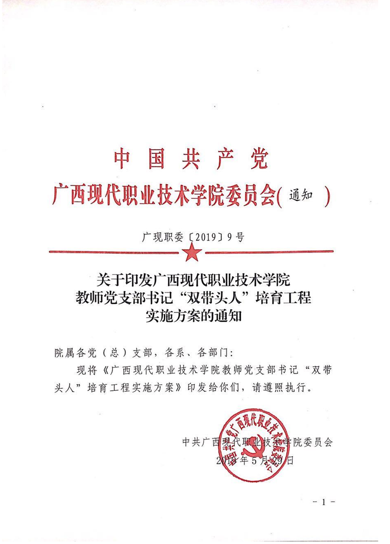 广现职委[2019]9号-广西现代职业技术学院教师党支部书记“双带头人”培育工程方案 来源: 发布时间:2019-05-30 09:15:09 浏览次数: 次 【字体:小 大】 终审:gxxdxcb003 【打印正文】 相关信息