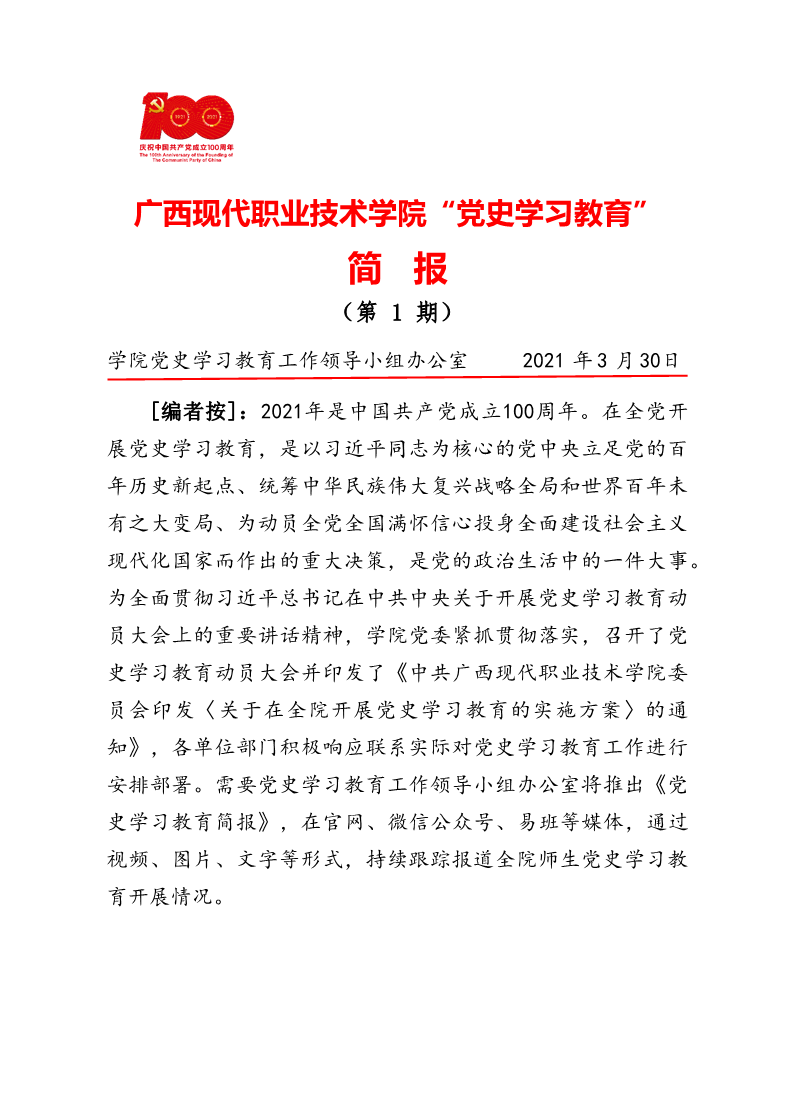 广西现代职业技术学院“党史学习教育”简报 第1期
