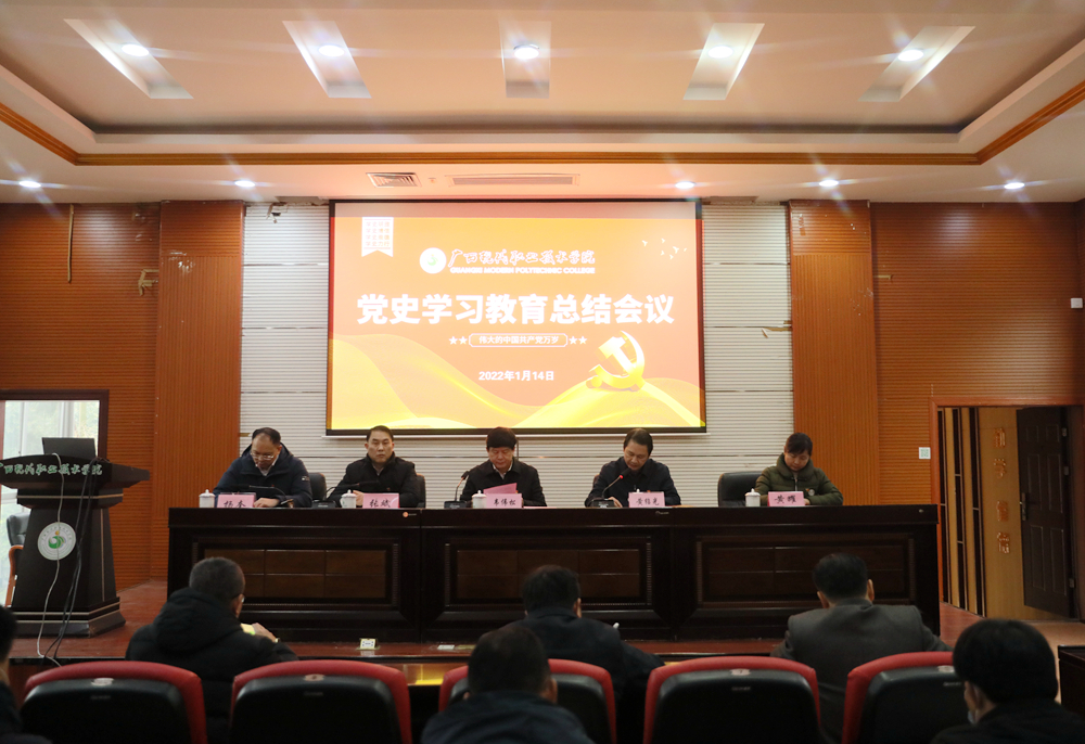 为深入学习习近平总书记重要讲话和重要指示精神,认真贯彻落实中央党史学习教育总结会精神,全面总结我院党史学习教育经验和成效,巩固深化党史学习教育成果,1月14日下午,学院在第二学术报告厅召开党史学习教育总结会议。河池学院党委副书记、学院党委书记韦伟松,学院院长、河池市职业教育中心学校校长黄绍光,纪委书记张斌,学院副院长黄耀、杨奎出席会议。全体教职工参加会议。会议由院长黄绍光主持。
