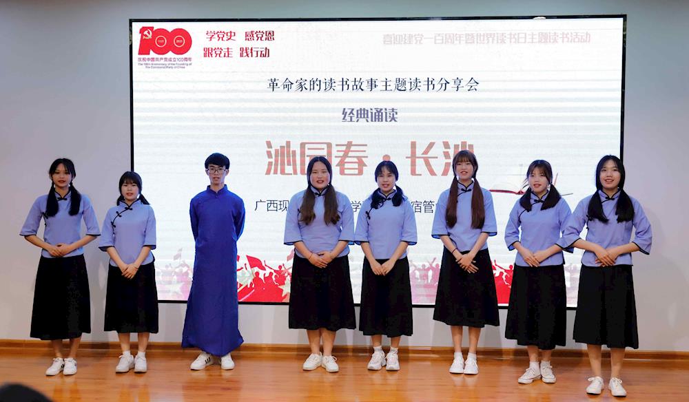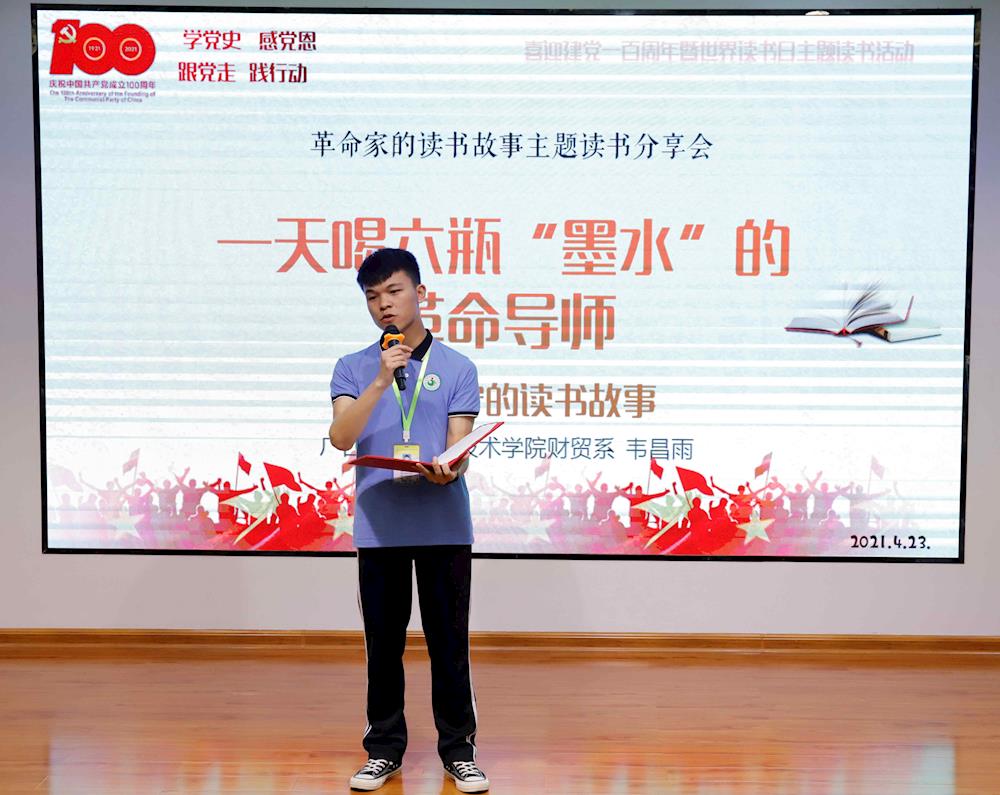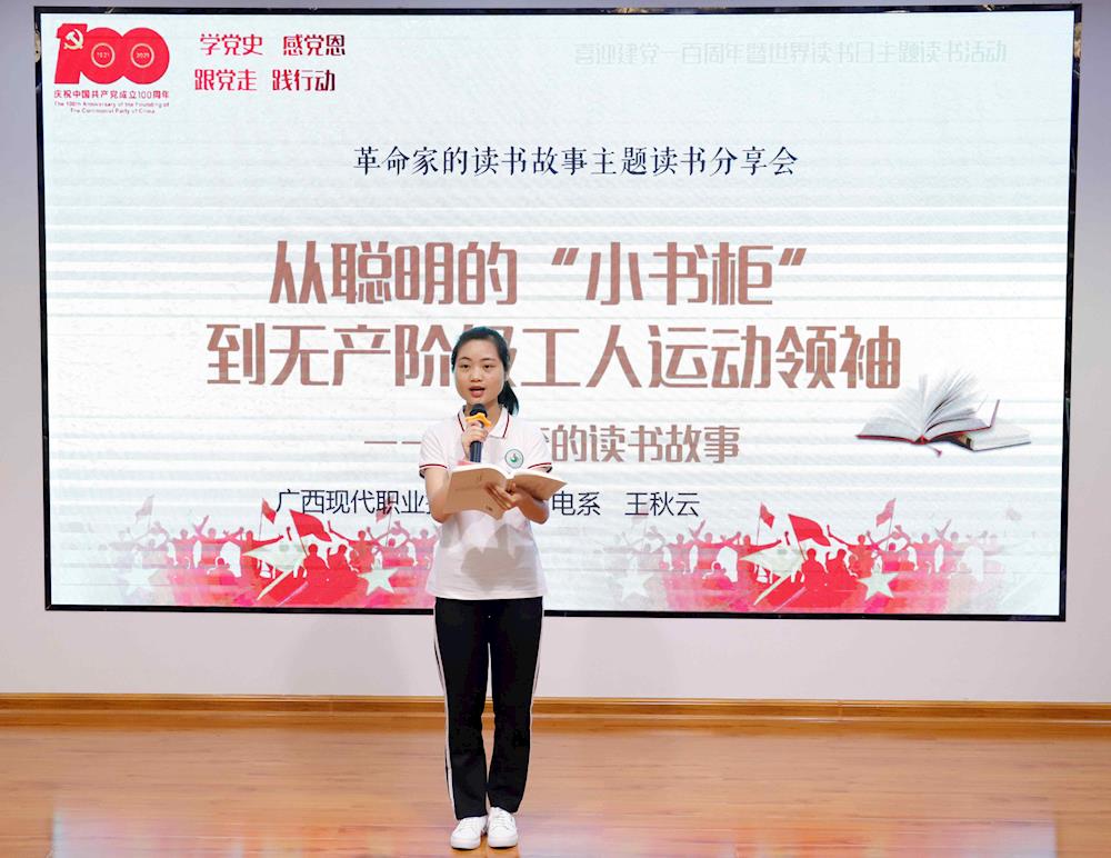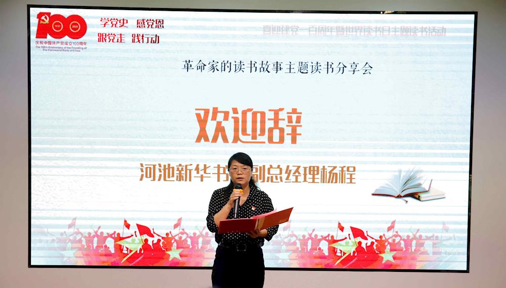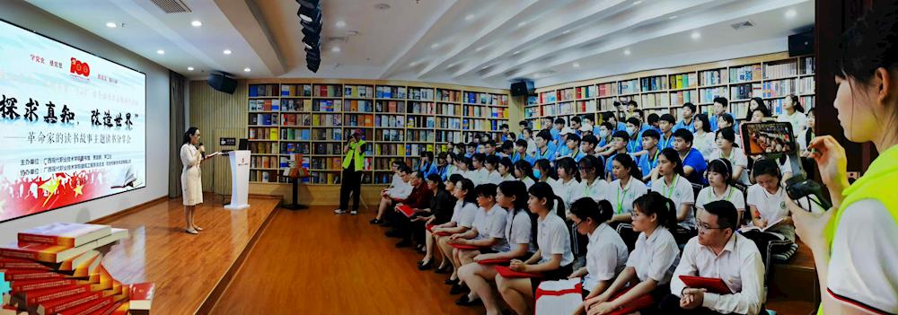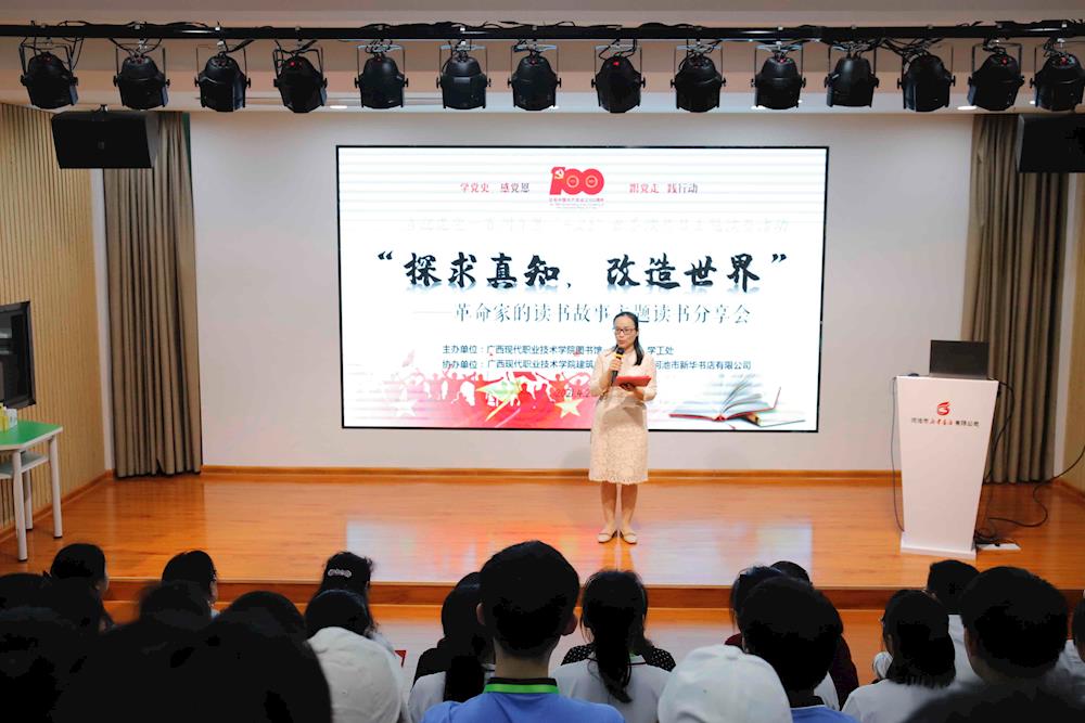 这是我院为迎接建党百年,于4月23日世界读书日当天下午在河池市新华书店举办的“革命家读书故事”主题读书分享活动现场。本次活动由图书馆、思政部、学工处联合举办,由建筑工程系党总支与河池市新华书店有限公司共同协办。河池市新华书店副总经理杨程出席本次活动并致欢迎辞。活动以“探索真知,改造世界”为主题,师生们分别讲述了马克思、列宁、毛泽东等思想家、革命家的读书故事。