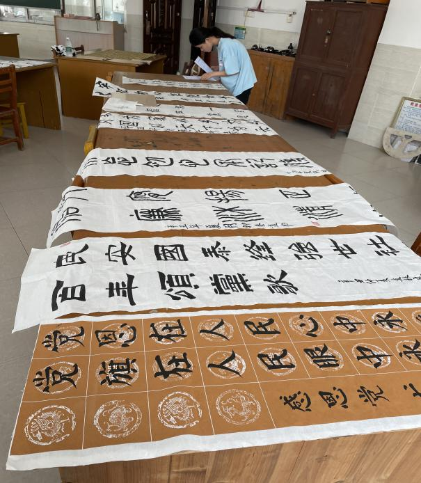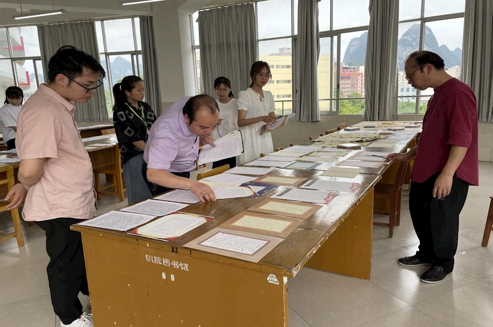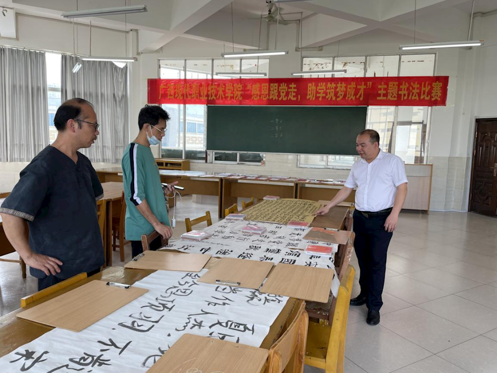 5月10日下午,蒙家辉老师、覃始洋老师、罗峰老师作为评委老师出席比赛现场,经过筛选,最终30幅作品脱颖而出。其中一等奖两名,二等奖五名,三等奖八名,优秀奖15名。学生资助工作办公室将选出的优秀作品推荐给有关媒体进行宣传和用于编印宣传资料,并推荐参加全区主题书法比赛。