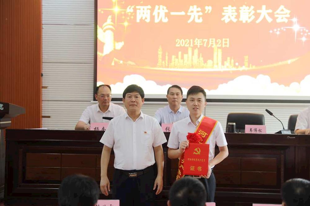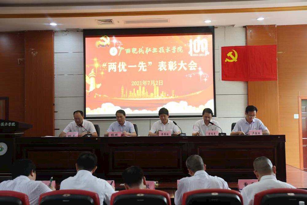为热烈庆祝中国共产党成立100周年,表彰先进、树立典型,向在党50年老党员致敬,7月2日下午,我院在第二学术报告厅召开2021年“两优一先”表彰大会。河池学院党委副书记、学院党委书记韦伟松,学院党委副书记、院长黄绍光,纪委书记张斌,副院长卢森焕、杨奎出席会议,全院师生党员参加会议。会议由黄绍光院长主持。