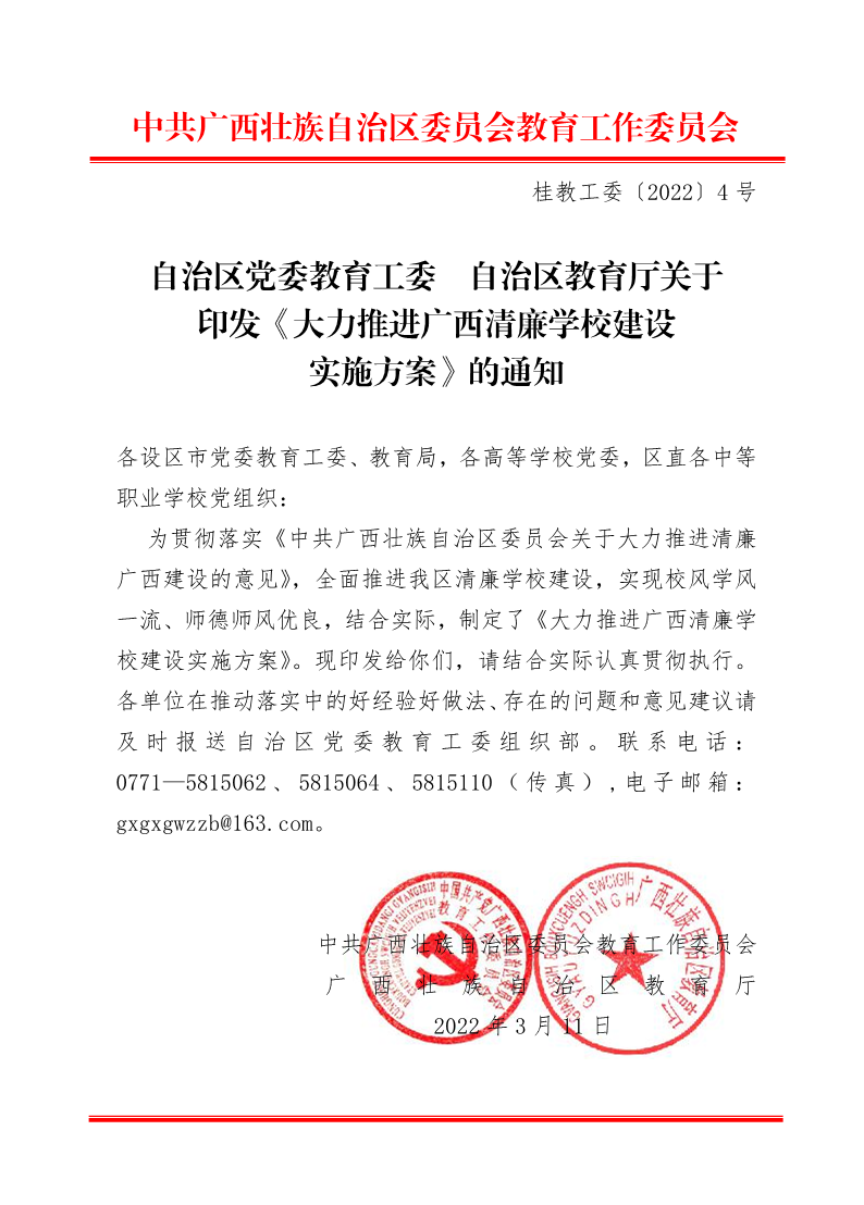 桂教工委〔2022〕4号自治区党委教育工委__自治区教育厅关于印发《大力推进广西清廉学校建设实施方案》的通知 来源:自治区党委教育工委 发布时间:2022-03-13 09:19:01 浏览次数: 次 【字体:小 大】 终审:gxxdxcb001 【打印正文】 相关信息