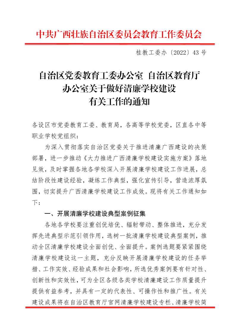 自治区党委教育工委办公室自治区教育厅办公室关于做好清廉学校建设有关工作的通知 来源:自治区党委教育工委 发布时间:2022-07-04 09:46:58 浏览次数: 次 【字体:小 大】 终审:gxxdxcb001 【打印正文】 相关信息