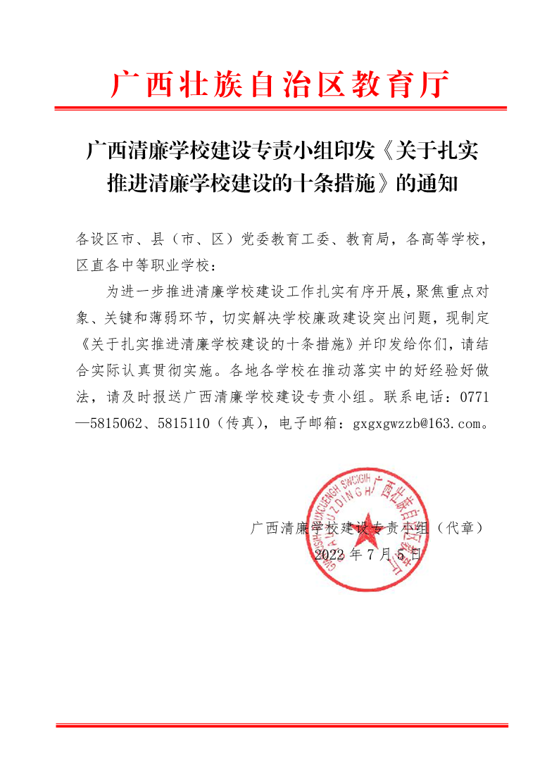 广西清廉学校建设专责小组印发《关于扎实推进清廉学校建设的十条措施》的通知 来源:纪检办 林鹏羽 发布时间:2022-07-08 11:56:29 浏览次数: 次 【字体:小 大】 终审:gxxdxcb001 【打印正文】 相关信息