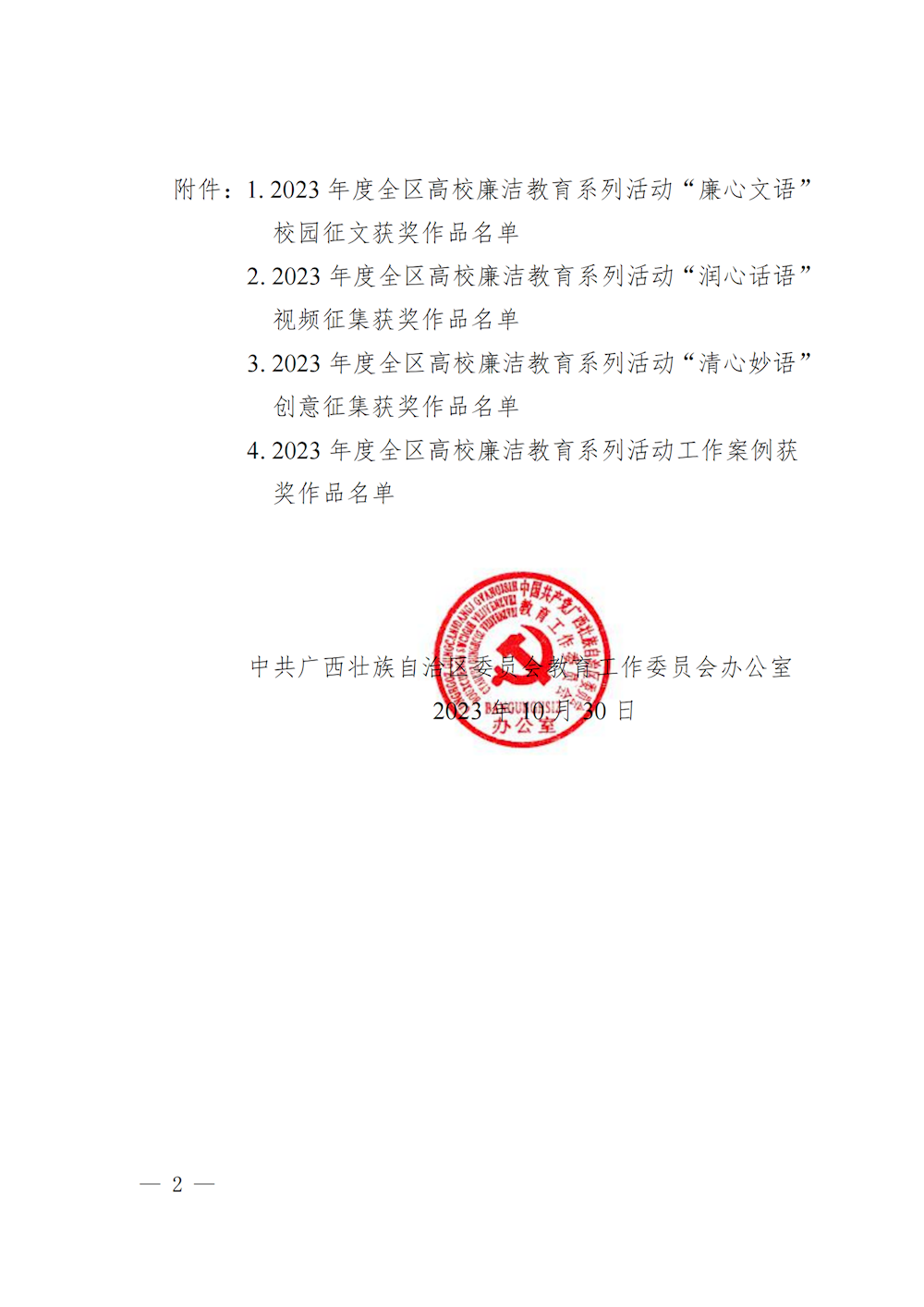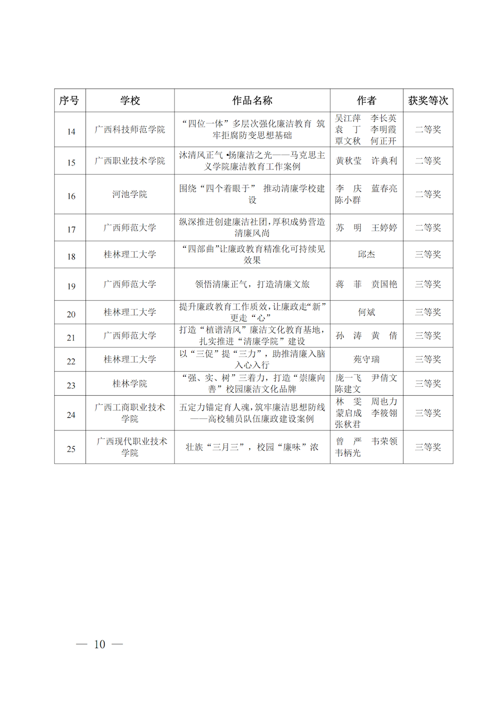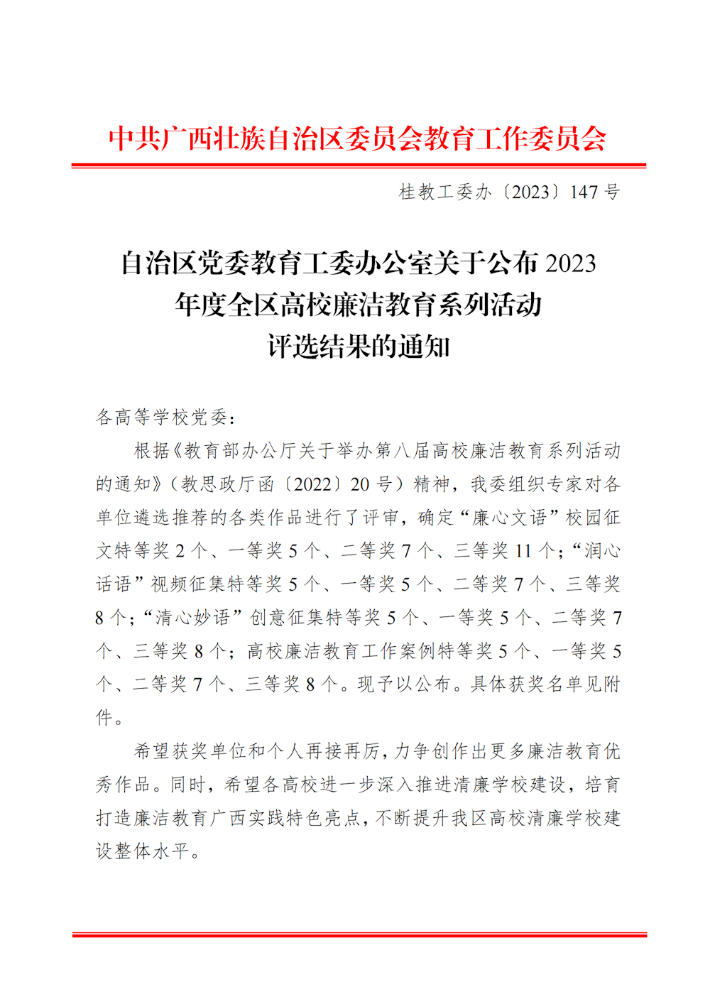 桂教工委办〔2023〕147号自治区党委教育工委办公室关于公布2023年度全区高校廉洁教育系列活动评选结果的通知 来源:广西壮族自治区委员会教育工作委员会办公室 发布时间:2023-11-01 16:15:18 浏览次数: 次 【字体:小 大】 终审:gxxdxcb007 【打印正文】 相关信息