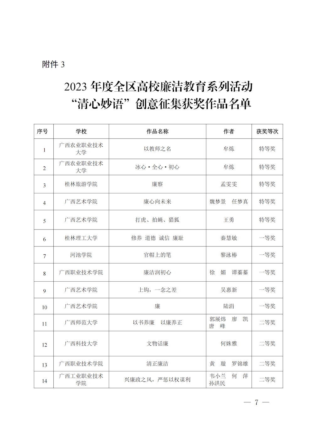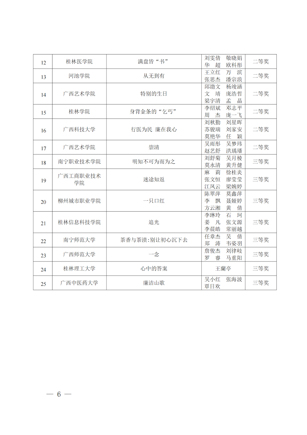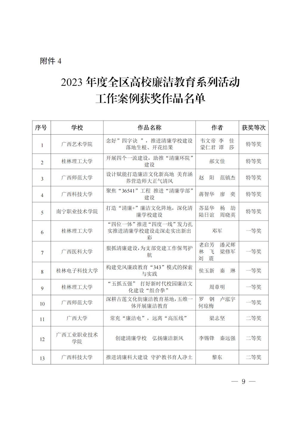 桂教工委办〔2023〕147号自治区党委教育工委办公室关于公布2023年度全区高校廉洁教育系列活动评选结果的通知 来源:广西壮族自治区委员会教育工作委员会办公室 发布时间:2023-11-01 16:15:18 浏览次数: 次 【字体:小 大】 终审:gxxdxcb007 【打印正文】 相关信息