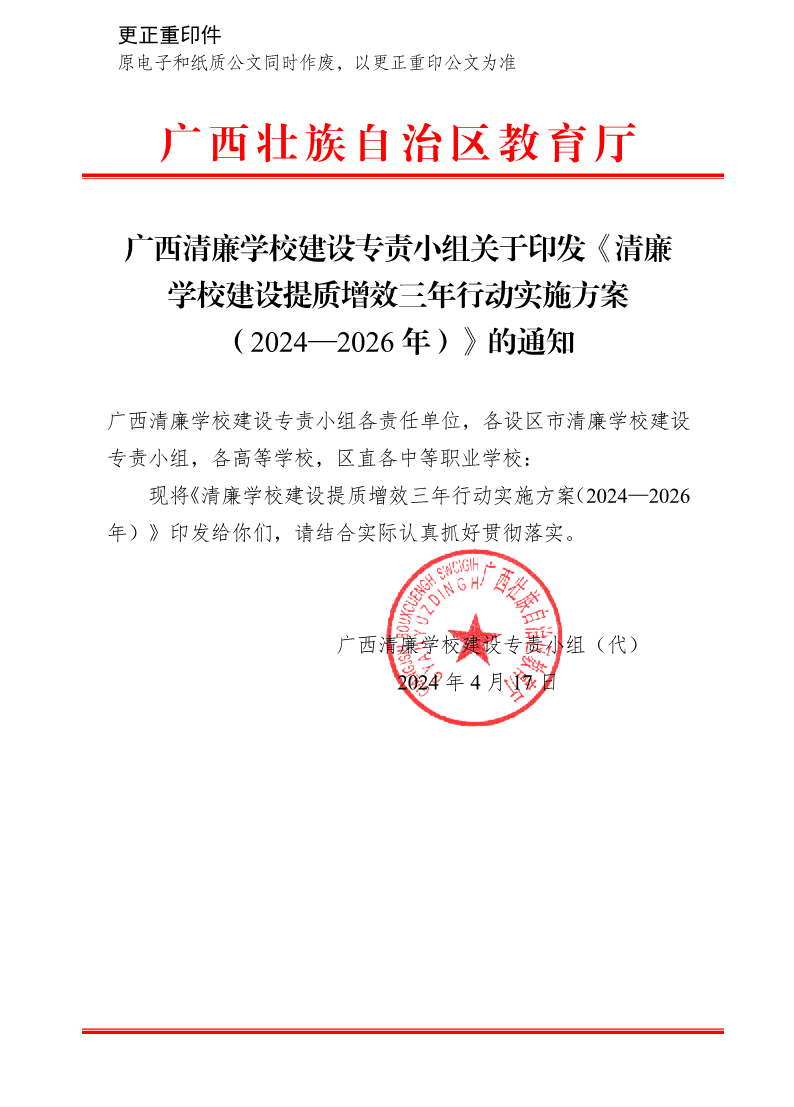 广西清廉学校建设专责小组关于印发《清廉学校建设提质增效三年实施方案(2024—2026年)》的通知 来源:广西清廉学校建设专责小组 发布时间:2024-04-18 10:05:42 浏览次数: 次 【字体:小 大】 终审:gxxdxcb007 【打印正文】 相关信息