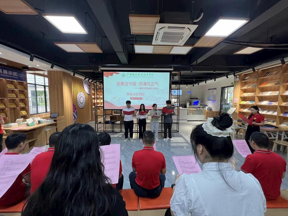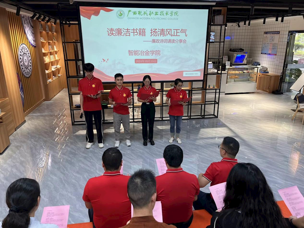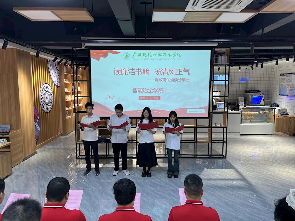 为深入推进党风廉政建设和清廉学校建设,弘扬廉洁文化,10月15日,智能冶金学院党支部在学校图书馆 “八桂书苑” 组织开展了 “廉政诗词诵读分享会”。此次活动邀请了智能冶金学院全体教职工参加,共同感受廉政文化的深厚底蕴。