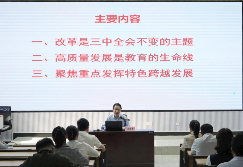 黄绍光校长指出,党的二十届三中全会是在以中国式现代化全面推进强国建设、民族复兴的关键时期召开的一次十分重要的会议,全体师生要切实增强学习宣传贯彻的政治自觉、思想自觉和行动自觉。一是要深刻认识全会主题,明确全面深化改革与推进中国式现代化之间的内在统一关系,明确“七个聚焦”,全面把握全会主题的内涵。二是要深入学习领会习近平总书记在党的二十届三中全会上的重要讲话精神,深刻认识党的二十届三中全会以来党和国家事业取得的重大成就,深刻认识进一步全面深化改革的重要性和必要性,把握“六个坚持”重大原则。三是全力以赴抓好全会精神的贯彻落实,提高政治站位,完善立德树人机制,统筹推进教育科技人才体制机制一体改革,加快构建育人新格局,办好人民满意的教育。