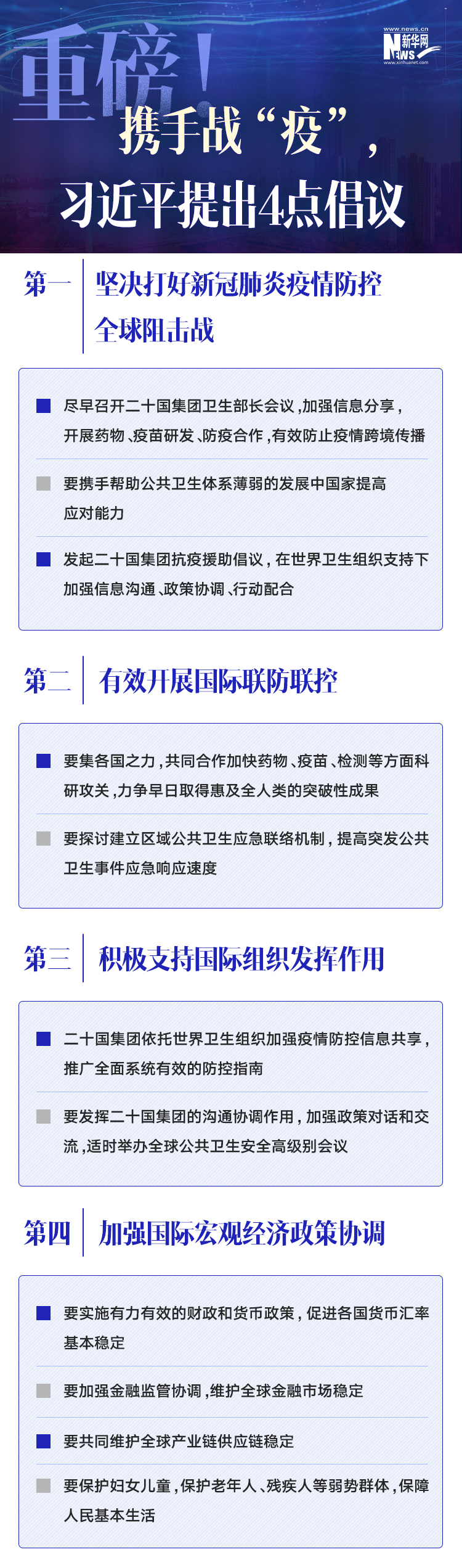“坚决打好新冠肺炎疫情防控全球阻击战”、“有效开展国际联防联控”、“积极支持国际组织发挥作用”、“加强国际宏观经济政策协调”,在二十国集团领导人应对新冠肺炎特别峰会上,习近平提出4点倡议,为全球协调行动抗击疫情指明方向。