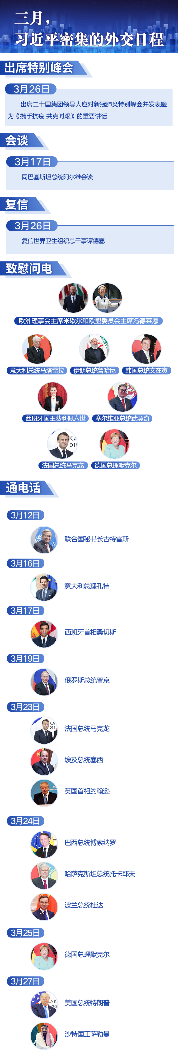 3月,习近平先后与美国总统特朗普、俄罗斯总统普京、英国首相约翰逊、法国总统马克龙、德国总理默克尔、意大利总理孔特、联合国秘书长古特雷斯等13位外国领导人和国际组织负责人通电话,同专程访华的巴基斯坦总统阿尔维会谈,向欧盟、韩国、伊朗、西班牙、塞尔维亚等领导人致慰问电,给世界卫生组织总干事谭德塞复信,出席G20新冠肺炎疫情特别峰会……