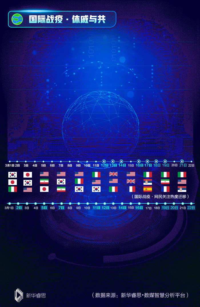患难见真情。中国以实实在在的行动,支援全球抗疫:派遣专家、交流经验、共享方案、捐赠物资、联合研发……一个又一个“硬核”举措,引发网友高度关注。新华睿思数据显示,中国派专家组驰援意大利、多国开建“方舱医院”等新闻事件,在关注度曲线上产生较高波动。与此同时,网友持续关注着韩国、日本、意大利、美国、伊朗、西班牙等国疫情进展。