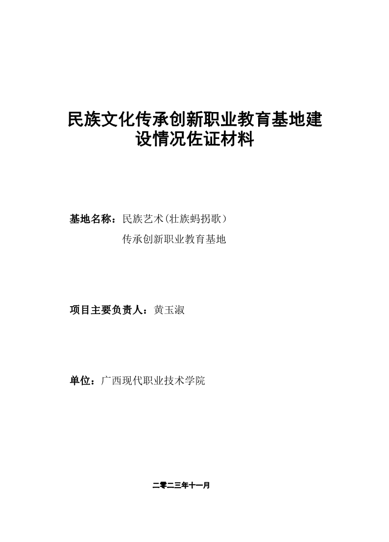 民族文化传承(壮族蚂拐歌)创新职业教育基地项目建设情况佐证材料 来源:教师教育学院 发布时间:2023-11-29 17:34:26 浏览次数: 次 【字体:小 大】 文件下载:民族文化传承(壮族蚂拐歌)创新职业教育基地项目建设情况佐证材料.pdf 终审:gxxdxcb003 【打印正文】 相关信息