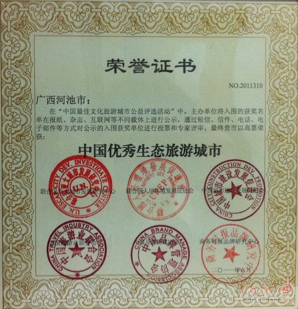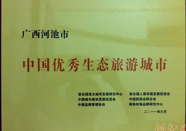 本网讯 2011年6月23日,在海南三亚市举办的第七届中国城市品牌大会暨影响力品牌公益评选活动颁奖盛典上传来喜讯,河池市荣获“中国优秀生态旅游城市”荣誉称号。