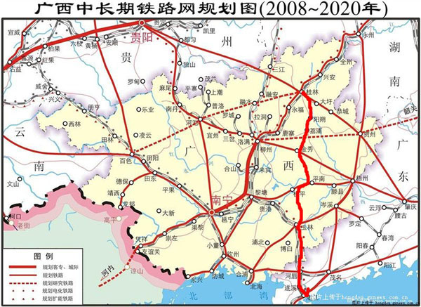 加强铁路建设。积极推动国家及自治区省际、城际快速铁路项目建设,建设河池-南宁铁路,力争开工建设贵阳-河池客运专线及黔桂铁路复线工程,重点推动建设桂林经河池至百色铁路。规划建设火车站、铁路货场等配套设施。