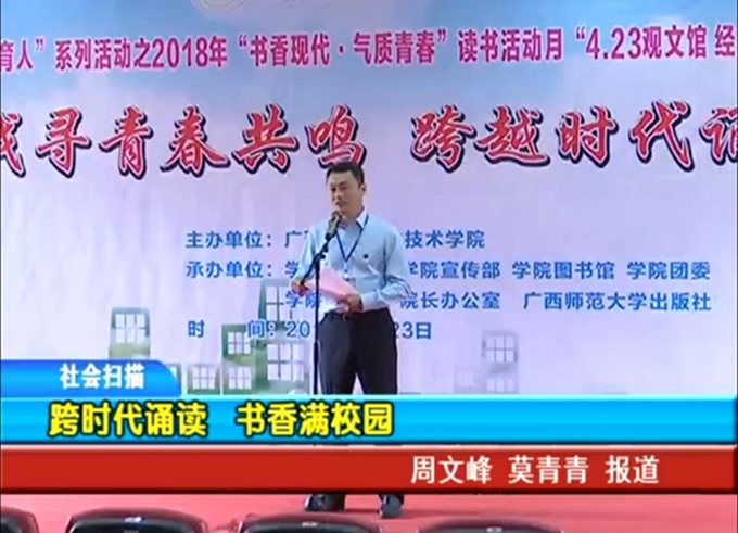 [社会扫描]跨时代诵读 书香满校园 来源: 发布时间:2018-04-25 09:03:32 浏览次数: 次 【字体:小 大】 【注:请点击以下网址进入观看我院“跨时代诵读 书香满校园”新闻报道】 点击网址:http://www.hcbtv.com/getNewsInfo.action?newsId=3918&flag=news 新闻截图: 【打印正文】 相关信息