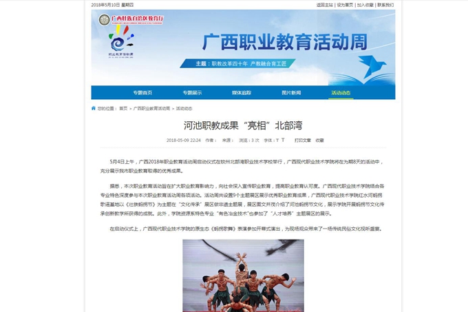[自治区教育厅网站]河池职教成果“亮相”北部湾 来源: 发布时间:2018-05-10 19:43:24 浏览次数: 次 【字体:小 大】 【注:请点击以下网址进入观看】 点击网址:http://www.gxedu.gov.cn/Item/18450.aspx 新闻截图: 【打印正文】 相关信息