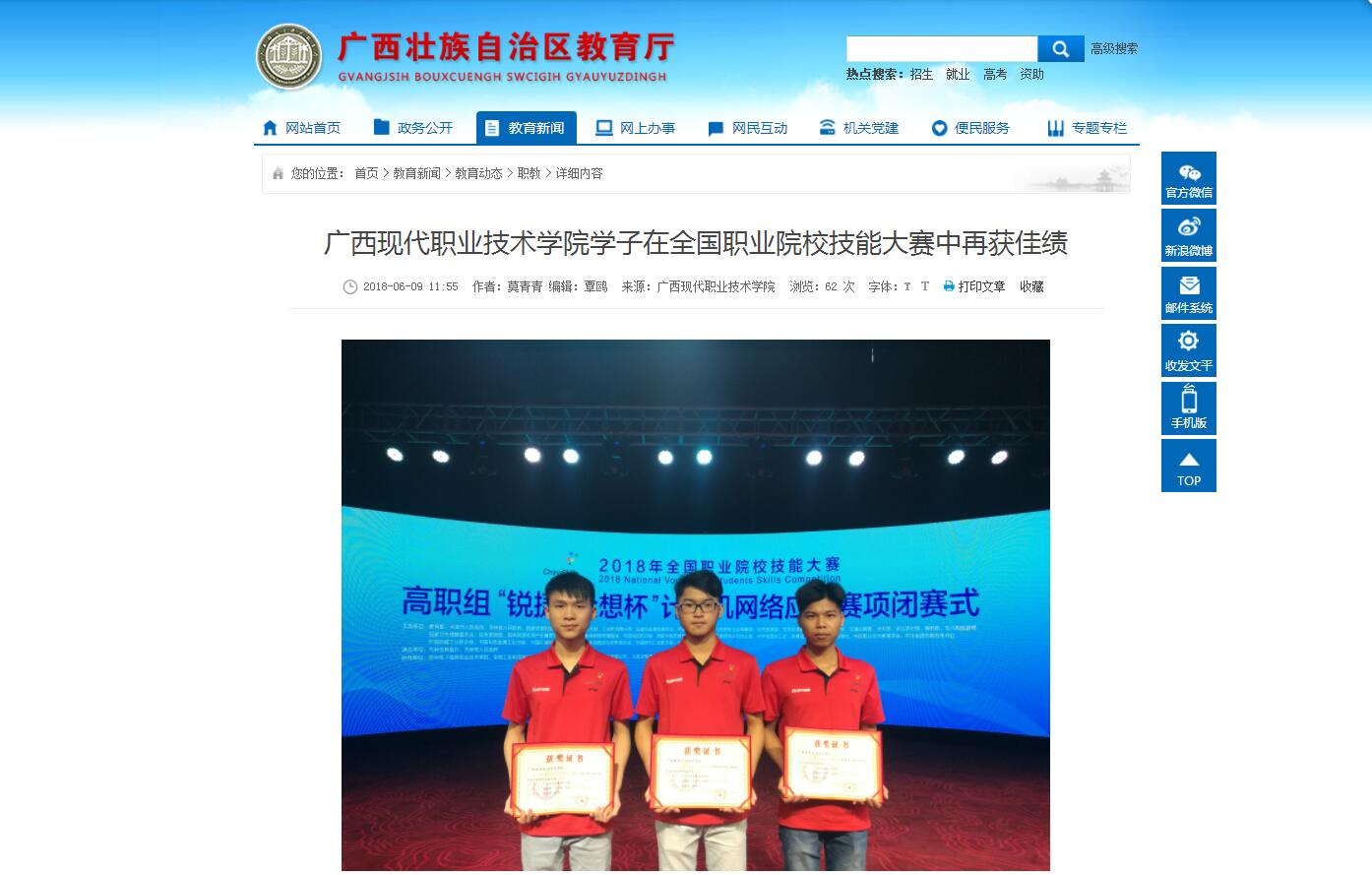 [自治区教育厅官网]广西现代职业技术学院学子在全国职业院校技能大赛中再获佳绩 来源: 发布时间:2018-06-11 18:49:17 浏览次数: 次 【字体:小 大】 【注:请点击以下网址进入观看】 点击网址:http://www.gxedu.gov.cn/Item/18898.aspx 新闻截图: 【打印正文】 相关信息