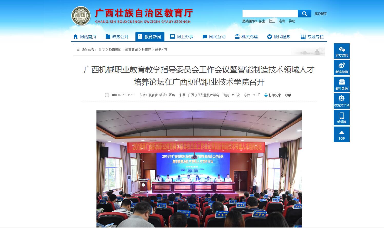 [自治区教育厅官网]广西机械职业教育教学指导委员会工作会议暨智能制造技术领域人才培养论坛在广西现代职业技术学院召开 来源: 发布时间:2018-07-12 09:09:32 浏览次数: 次 【字体:小 大】 【注:请点击以下网址进入观看】 点击网址:http://www.gxedu.gov.cn/Item/19125.aspx 新闻截图: 【打印正文】 相关信息