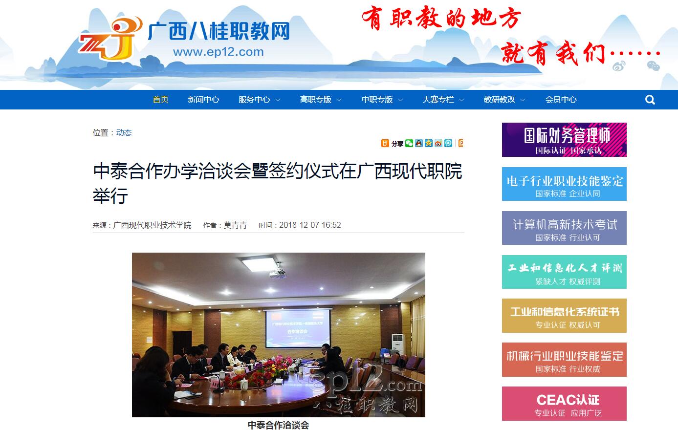 [八桂职教网]中泰合作办学洽谈会暨签约仪式在广西现代职院举行 来源: 发布时间:2018-12-07 18:41:00 浏览次数: 次 【字体:小 大】 新闻截图: 终审:administrator 【打印正文】 相关信息