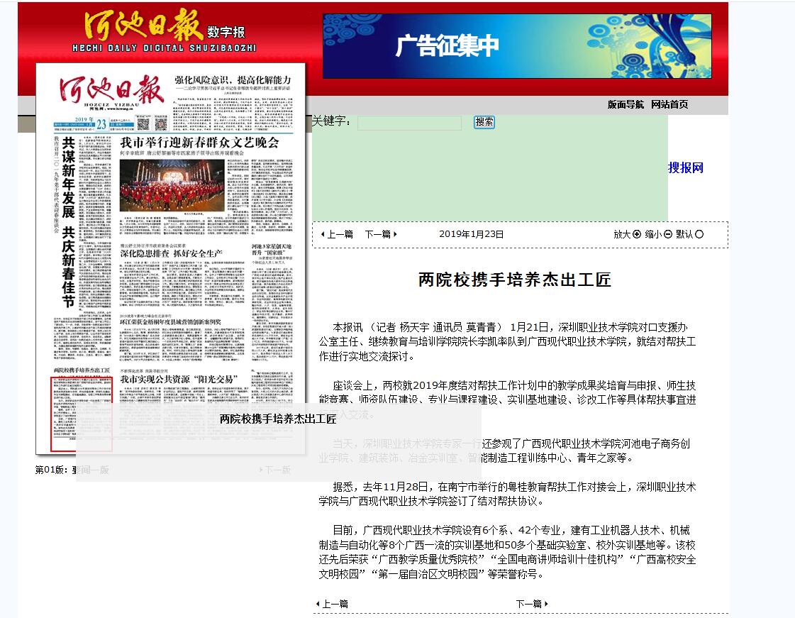 [河池日报]两院校携手培养杰出工匠 来源: 发布时间:2019-01-23 12:46:36 浏览次数: 次 【字体:小 大】 作者: | 日期:2019-1-23 12:46:36 | 浏览数:465 | 今日浏览数:1 新闻截图: 【打印正文】 相关信息