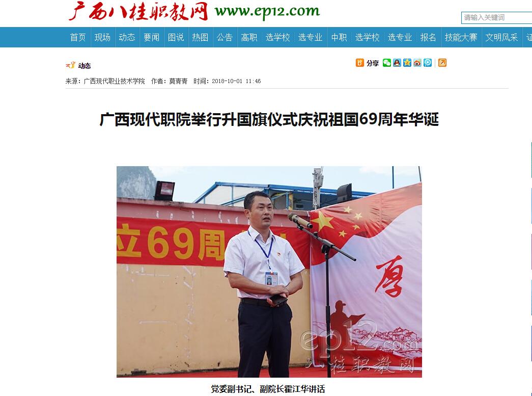 [八桂职教网]广西现代职院举行升国旗仪式庆祝祖国69周年华诞 来源: 发布时间:2018-10-01 16:27:37 浏览次数: 次 【字体:小 大】 作者: | 日期:2018-10-1 16:27:37 | 浏览数:668 | 今日浏览数:1 新闻截图: 【打印正文】 相关信息