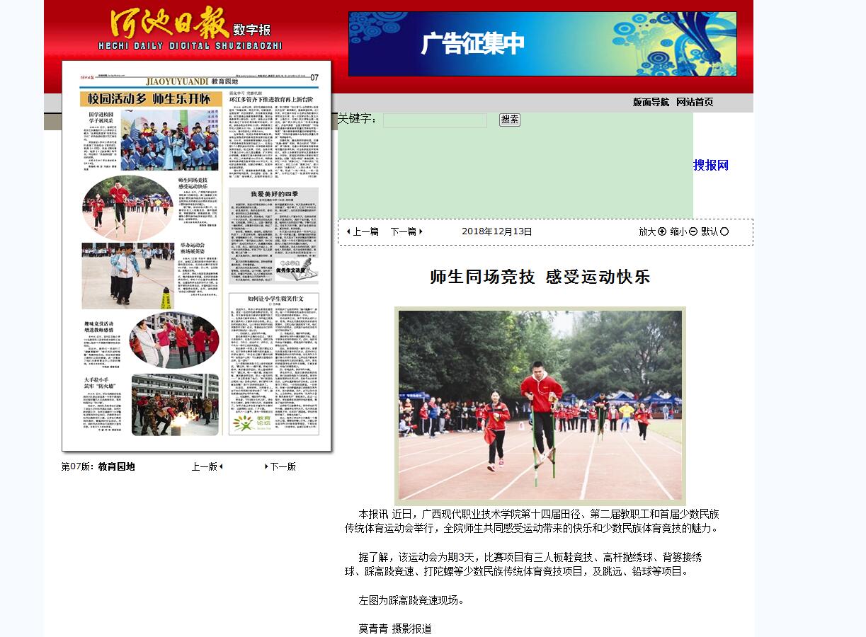 [河池日报]师生同场竞技 感受运动快乐 来源: 发布时间:2018-12-14 09:15:24 浏览次数: 次 【字体:小 大】 作者: | 日期:2018-12-14 9:15:24 | 浏览数:235 | 今日浏览数:2 新闻截图: 【打印正文】 相关信息