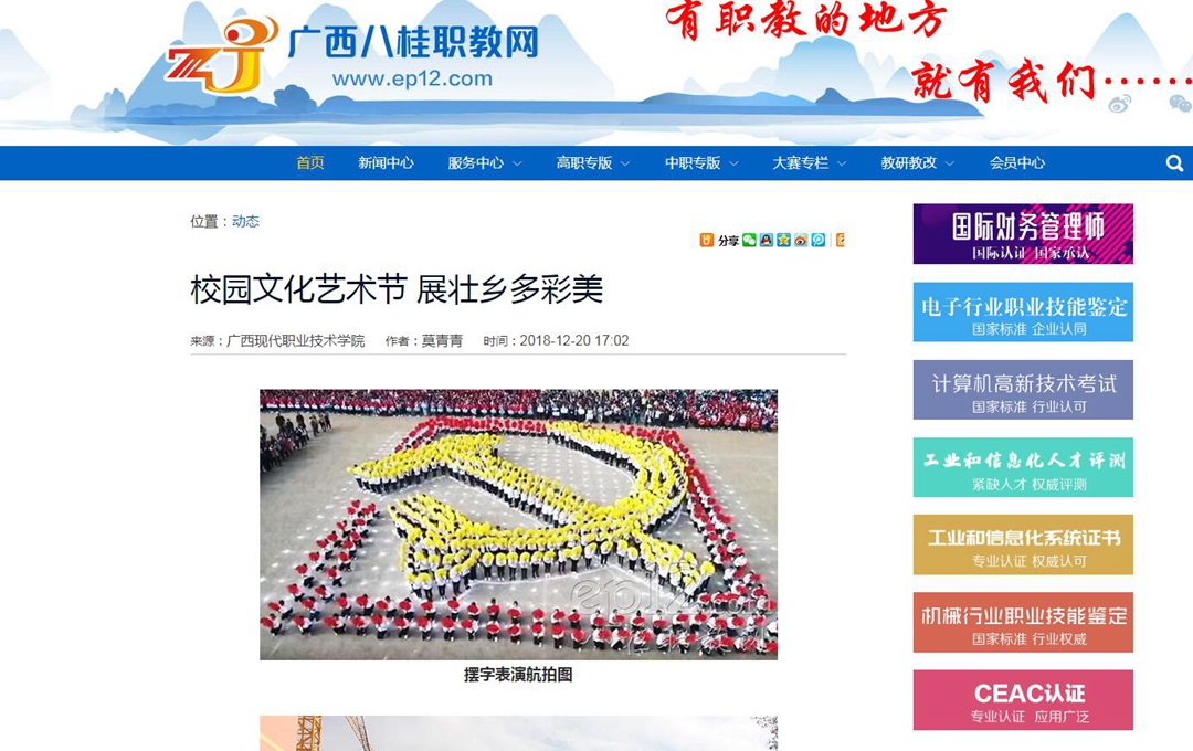 [八桂职教网]校园文化艺术节 展壮乡多彩美 来源: 发布时间:2018-12-21 19:24:37 浏览次数: 次 【字体:小 大】 作者: | 日期:2018-12-21 19:24:37 | 浏览数:194 | 今日浏览数:1 新闻截图: 【打印正文】 相关信息