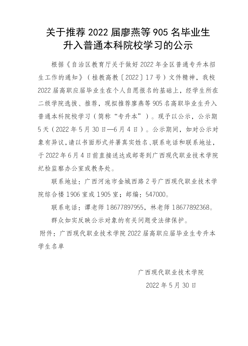 关于推荐2022届廖燕等905名毕业生 升入普通本科院校学习的公示 来源:文/图 谭高峰 发布时间:2022-05-30 19:00:02 浏览次数: 次 【字体:小 大】 终审:gxxdxcb004 【打印正文】 相关信息