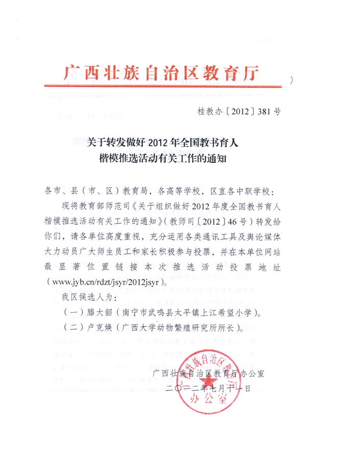 关于转发做好2012年度全国教书育人楷模推选活动有关工作的通知