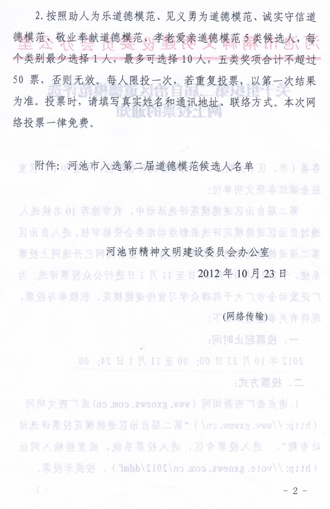 关于组织第二届自治区道德模范评选网上投票的通知 来源: 发布时间:2012-10-29 09:02:22 浏览次数: 次 【字体:小 大】 关于组织第二届自治区道德模范评选网上投票的通知 院属各单位、部门: 接市文明办通知,第二届自治区道德模范评选活动中,我市推荐10名候选人通过自治区道德模范评选表彰活动组委会资格审核,进入自治区第二届道德模范候选人名单,要求我院全体师生学习宣传道德模范,积极参与投票。具体内容详见附件。 附件:关于组织第二届自治区道德模范评选网上投票的通知 院长办公室 2012年10月29日 【打印正文】 相关信息