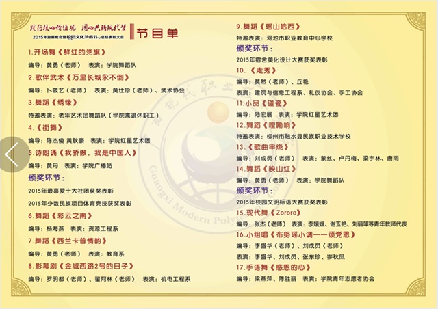 附件:“践行核心价值观 同心共铸现代梦”2015年迎新晚会暨校园文化艺术节总结表彰大会节目单