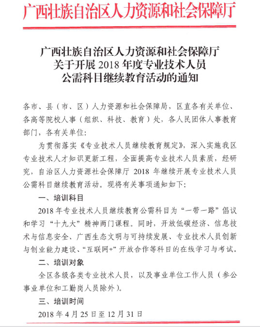 现将自治区人力资源和社会保障厅《关于开展2018年专业技术人员公需科目继续教育活动的通知》转发给你们,请按文件要求组织本部门有关人员按时参加继续教育活动。