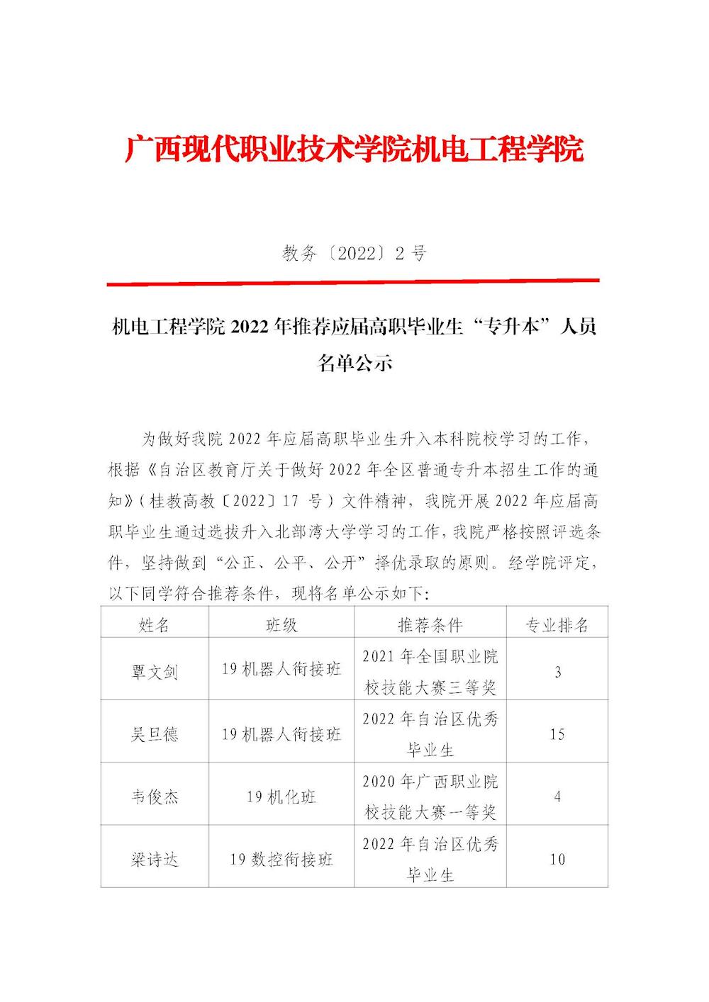 机电工程学院 2022 年推荐应届高职毕业生“专升本”人员名单公示