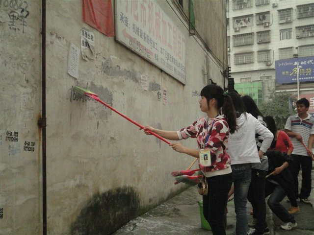上图:同学们在街上清理“牛皮癣广告”现场。