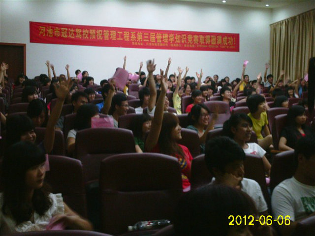 本站管理工程系学生会宣传部讯(李伯林) 为了丰富我系广大青年学生的校园生活,深化同学们对管理学知识的认识,加强校园学习氛围,促进学风建设和精神文明建设,我系于2012年6月6日晚7:30在学院第一学术报告厅举办了第三届管理学知识竞赛活动。出席此次活动的有:系领导韦永福主任、各专业课教师代表、赞助商代表、各班辅导员以及各系学生会代表和我系大一的全体同学。