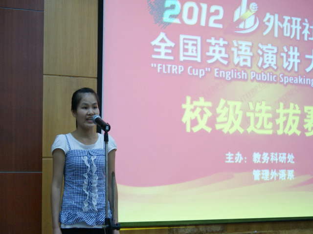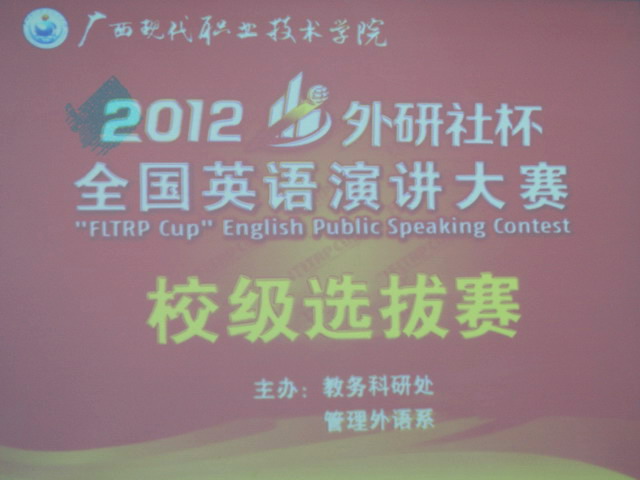 管理工程系、外国语系讯(匡华 覃素香)由我院教务科研处和管理外语系共同举办的2012年“外研社杯”全国英语演讲比赛暨广西现代职业技术学院选拔赛于2012年10月30日晚圆满落下帷幕,来自我院各系的18名选手参加了主题为“What We Can Not Afford to Lose”的演讲比赛。