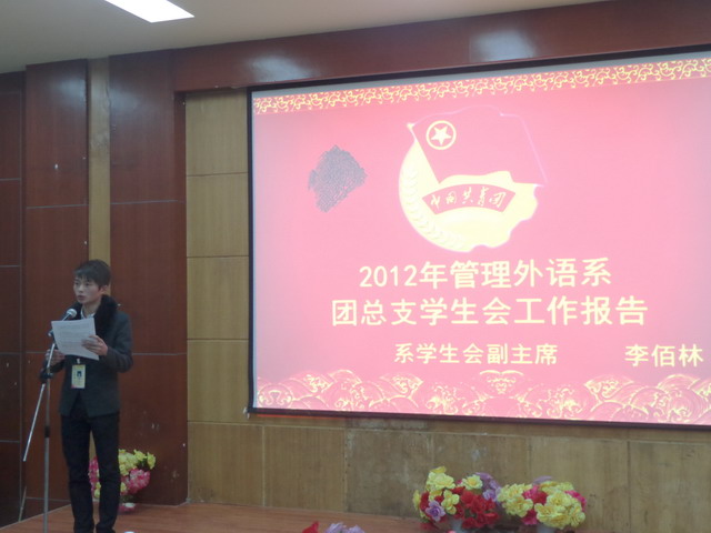 大会由我系第九届团总支、学生会体育部副部长黎锦泉同学致开幕词。 会上,学生会副主席李佰林同学代表第九届团总支、学生会作2012年工作报告。报告中,他对一年来的工作进行了回顾和总结,在肯定我系团总支、学生会工作取得优异成绩的同时,也指出一些不足,并提出今后的工作设想。紧接着,我系43名候选人依次上台进行精彩的竞选演讲,参加大会的160名正式代表进行了民主投票,有34名候选人以高票胜出,当选为新一届团总支、学生会成员。