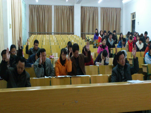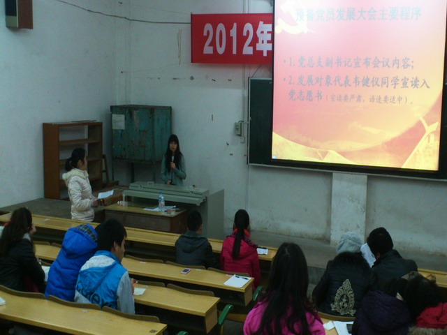 会上,党总支副书记黄耀同志首先宣布会议内容。接着,发展对象代表韦健仪同学宣读入党志愿书,并作个人总结。67名发展对象依次发言,总结自己的入党动机,对党的认识,自己的优缺点及今后的打算,入党介绍人(培养人)将培养的情况进行介绍,肯定培养对象的优点,指出存在的不足,表明是否同意吸纳入党的意见。出席会议的正式党员采取举手方式逐一进行表决,一致同意接收67名发展对象为预备党员。