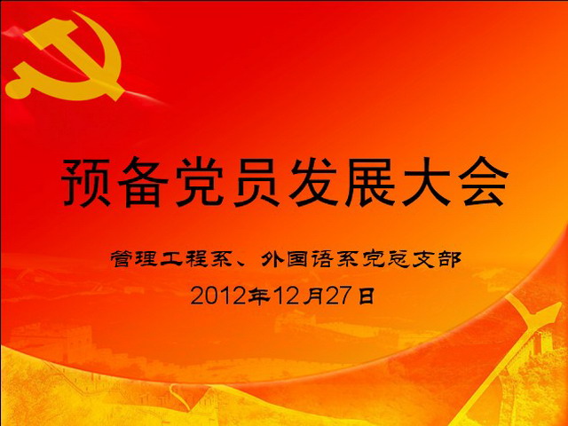 管理系、外语系讯(钟剡、杨宗斌) 2012年12月27日晚,管理工程系、外国语系党总支部在第一教学楼第二阶梯教室召开预备党员发展大会。管理工程、外国语系党总支16名正式党员和67名发展对象参加了大会。管理工程系、外国语系党总支副书记黄耀同志主持会议。